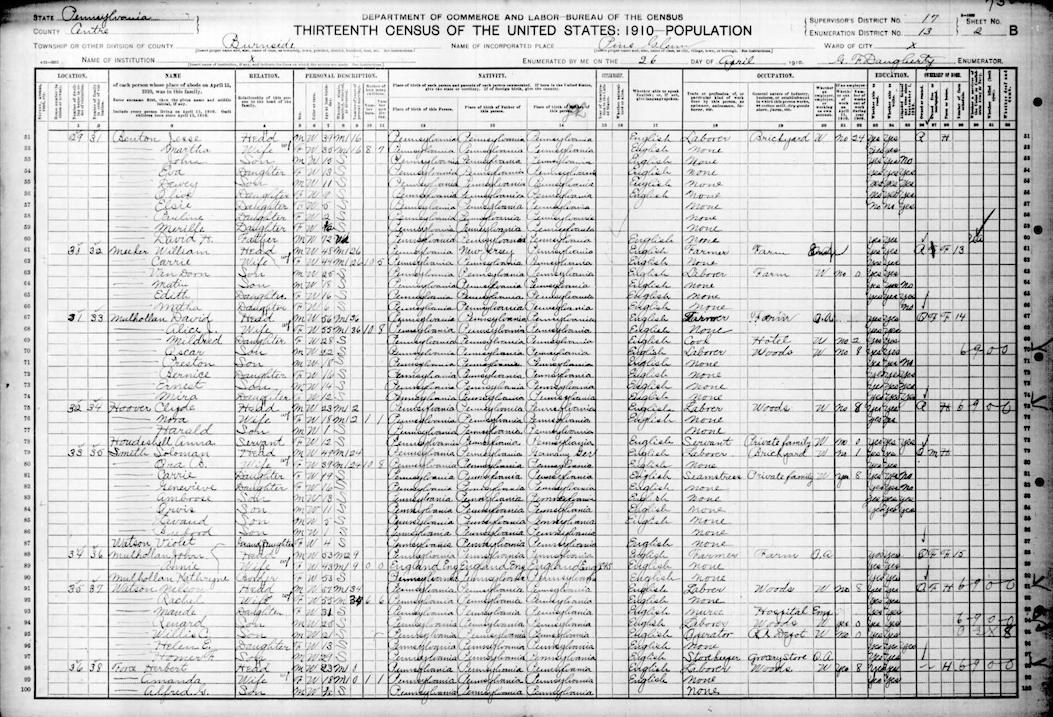 - 1910 United States Federal Census, Centre County, Pennsylvania, population schedule, Burnside Township, enumeration district 13, sheet 2B, dwelling 32, family 34, Clyde Hoover household; online, Internet Archive, “13th census, 1910” (http://www.archive.org : accessed 23 Oct 2016); citing National Archives and Records Administration, microfilm T624, roll 1325. ↩